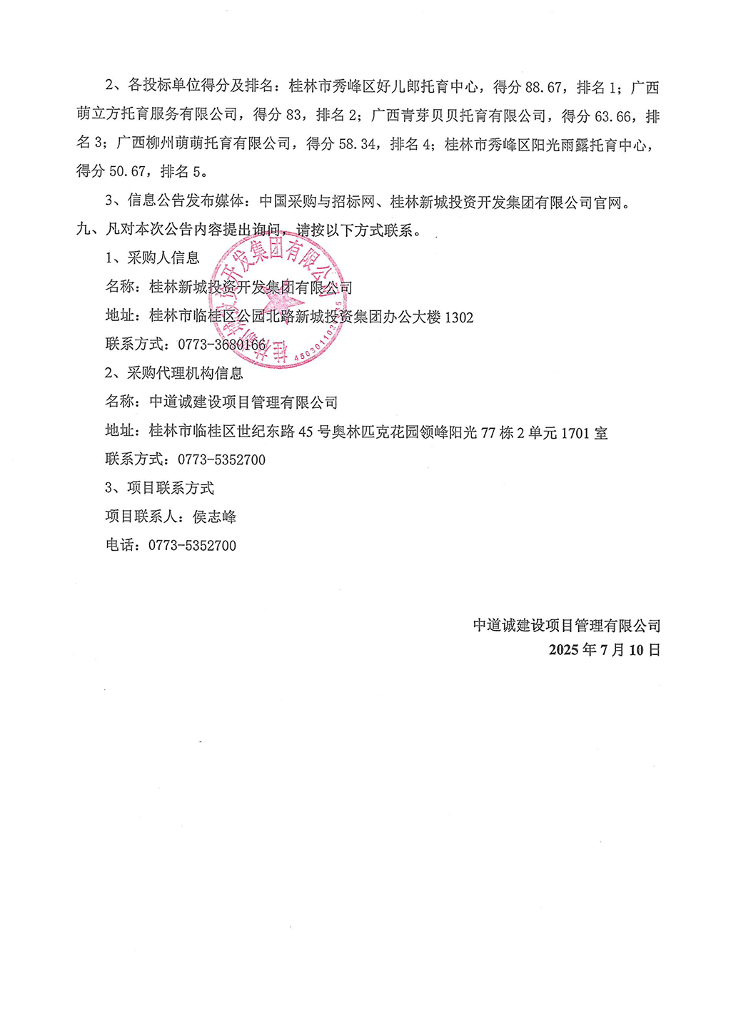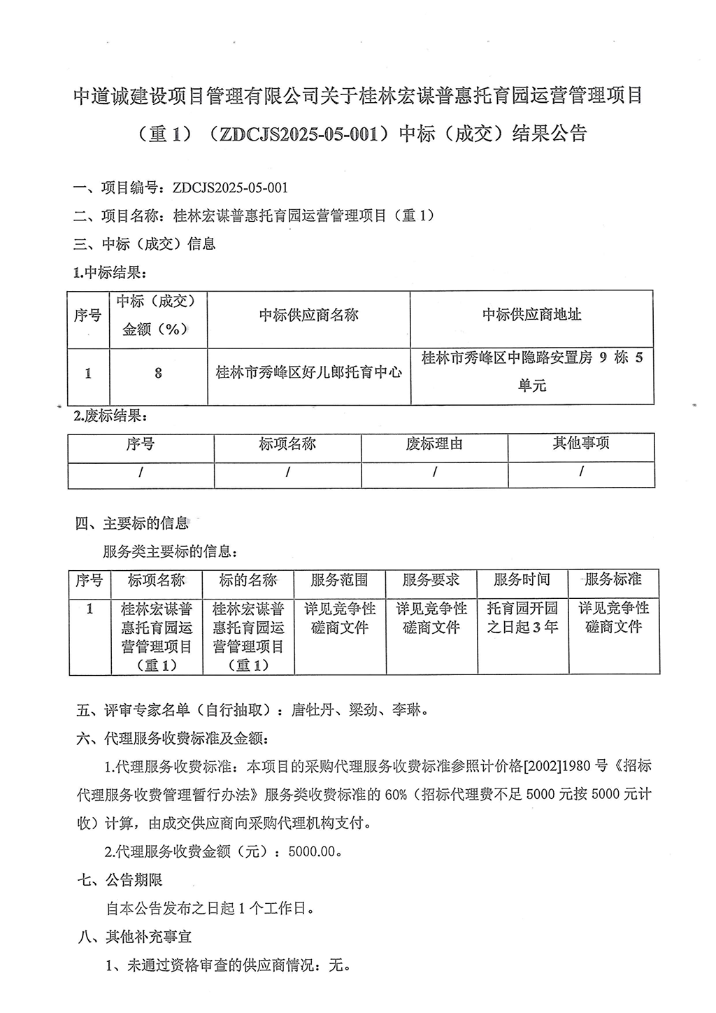 中道誠建設(shè)項目管理有限公司關(guān)于桂林宏謀普惠托育園運(yùn)營管理項目(重1)(ZDCJS2025-05-001)中標(biāo)(成交)結(jié)果公告