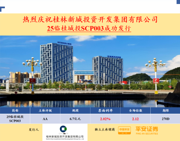 8月6日,桂林新城投資開(kāi)發(fā)集團(tuán)有限公司成功發(fā)行2025年度第三期超短期融資券,規(guī)模6.7億元,票面利率2.02%,認(rèn)購(gòu)倍數(shù)2.12倍,本期超短融由平安證券獨(dú)立承銷(xiāo)。此次成功發(fā)行超短融利率僅次于2025年度第二期超短融創(chuàng)下的“桂林市有史以來(lái)信用債發(fā)行的最低利率2.01%”!